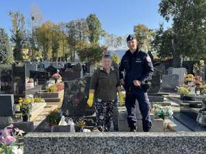 Policjanci z powiatu puckiego rozmawiają o zasadach bezpieczeństwie z odwiedzającymi groby przed Dniem Wszystkich Świętych.