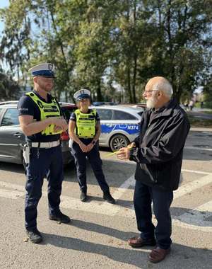 Funkcjonariusze z puckiej drogówki przekazują osobom starszym elementy odblaskowe, dbając o ich bezpieczeństwo na drodze i przypominając, że bycie widocznym to ochrona życia i zdrowia.