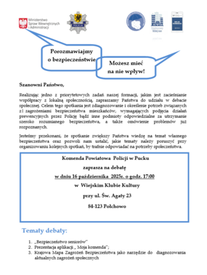 Realizując jedno z priorytetowych zadań naszej formacji, jakim jest zacieśnianie współpracy z lokalną społecznością, puccy policjanci zapraszają na debatę. Celem tego spotkania jest zdiagnozowanie i określenie potrzeb związanych z zagrożeniami bezpieczeństwa mieszkańców, wymagających podjęcia działań prewencyjnych przez Policję bądź inne podmioty odpowiedzialne za utrzymanie szeroko rozumianego bezpieczeństwa oraz omówienie problemów już rozpoznanych