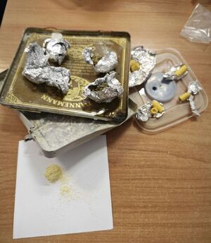 Podczas przeszukania przy zatrzymanym nie ujawniono zabronionych substancji. Policjanci zdecydowali jednak o sprawdzeniu pomieszczeń mieszkania. Na półce ściennej znaleźli plastikowy pojemnik, w którym znajdowało się kilka srebrnych zawiniątek z różnymi substancjami w tym z suszem koloru zielonego oraz sypkimi i skrystalizowanymi substancjami koloru żółtego i białego. Zabezpieczone środki zostały przekazane do dalszych badań. Po przebadaniu substancji okazało się, że wśród nich znajdowały się m.in. marihuana, metamfetamina oraz amfetamina.