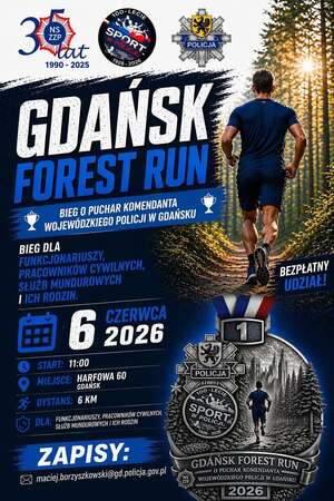 Celem wydarzenia GDAŃSK FOREST RUN 2026 jest promocja aktywności fizycznej, integracja środowiska służb mundurowych oraz wspólne sportowe uczczenie jubileuszu 100-lecia sportu w Policji Polska Policja. Każdy uczestnik, który ukończy bieg, otrzyma pamiątkowy medal okolicznościowy, przygotowany specjalnie na tę edycję wydarzenia.. Zapraszamy wszystkich, którzy chcą sprawdzić swoje możliwości, spędzić aktywnie czas i wziąć udział w wyjątkowym wydarzeniu sportowym w leśnej scenerii.